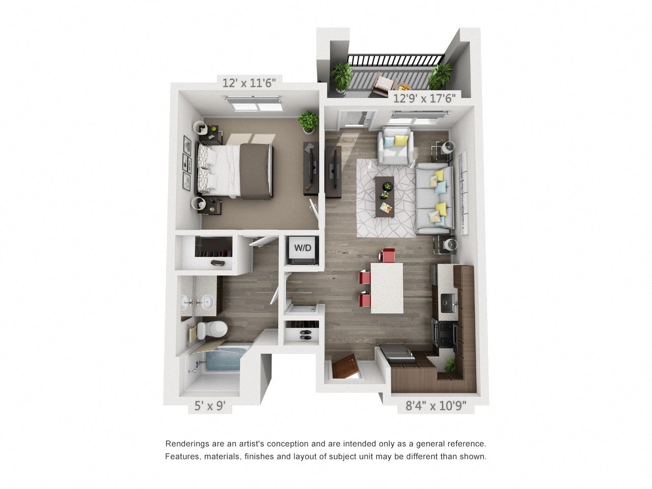 Rendering of the Silver floor plan with 1 bedroom[s] and 1 bathroom[s] at 4th West