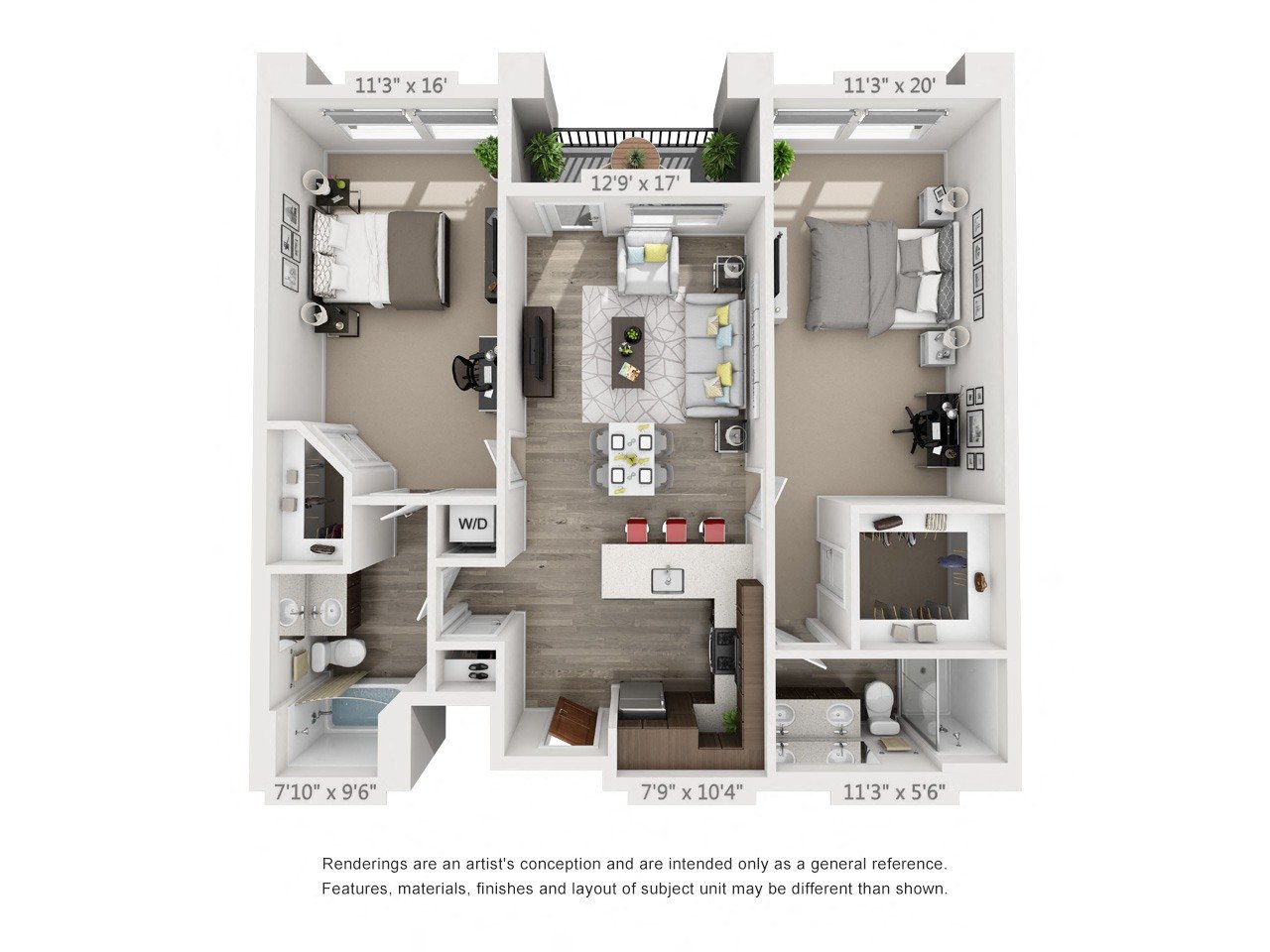 Rendering of the Olympus floor plan with 2 bedroom[s] and 2 bathroom[s] at 4th West